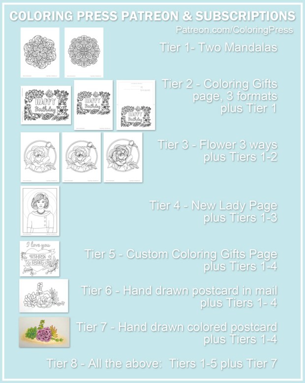 I have been listening to feedback and have been working on increasing access to electronic downloads. I have finished setting up Subscriptions and also Patreon to make some of my pages more easily available via electronic downloads (Patreon is a subscription service where you sign up to receive different rewards from artists.) All coloring pages are never before published, they won’t be available for sale until later when they are published in a book. Everyone who joins my Patreon at any tier level by August 14 will receive 3 additional bonus coloring pages. https://www.patreon.com/ColoringPress